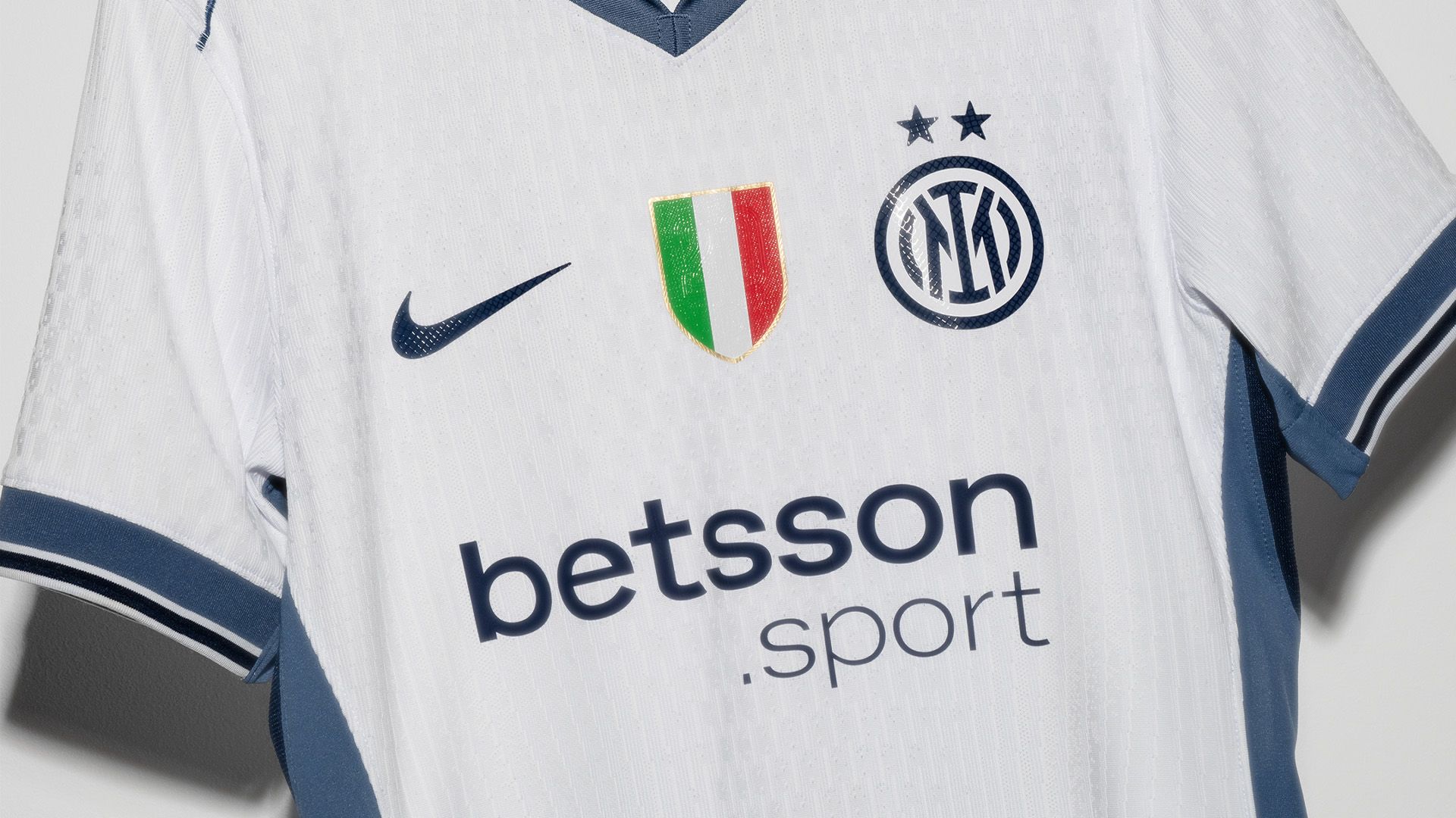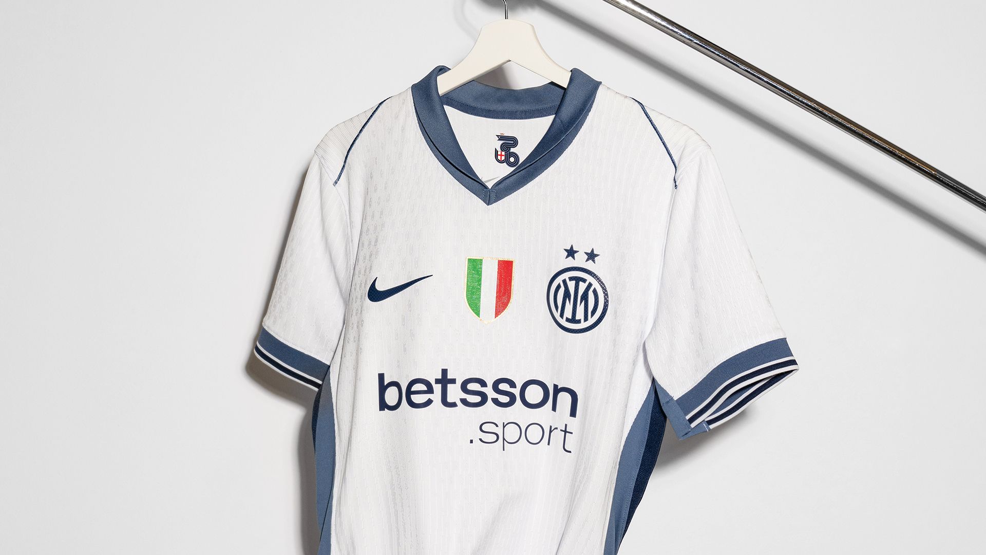 White dominates the shirt and is synonymous with style and elegance. It is enriched by grey tones – a colour that is historically part of Inter’s DNA – on the shoulders, chest, and sleeves. The tricolour returns to the centre of the shirt, with the monogram badge and two stars placed on the heart. The shirt also has a collar, which reawakens decades worth of unforgettable football memories.